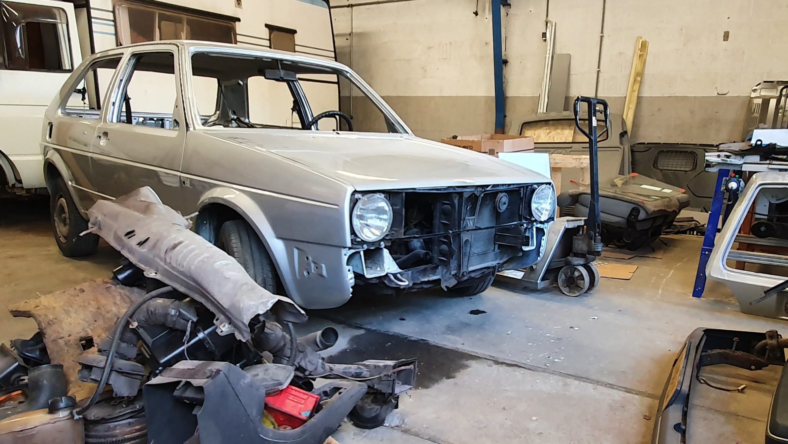 Zo kwamen er nieuwe spatbordranden, dorpels, stukken bodemplaat, schutbord, achterlichtframes, zijpanelen, etc in. Na het laswerk werd de gehele auto van binnen en van buiten opnieuw in de originele zilvergrijze kleur gespoten. Een automaat van een Golf Mk2 was snel gevonden, maar de ontbrekende schakelkabel moet nog worden nagemaakt. Op dit moment ondergaat Autobedrijf Mazier een flinke metamorfose, dus staat het project even stil. Naar verwachting zal het afmaken in 2026 verder gaan.